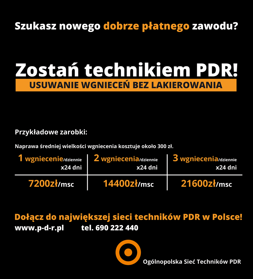 - zajęcia praktyczne elementach karoserii oraz samochodów klientów - naprawy PDR i GPDR oraz naprawy panelowe oraz "push to paint "